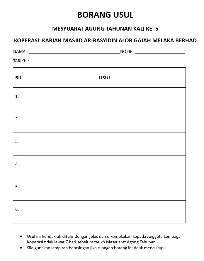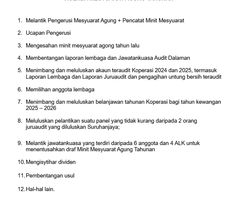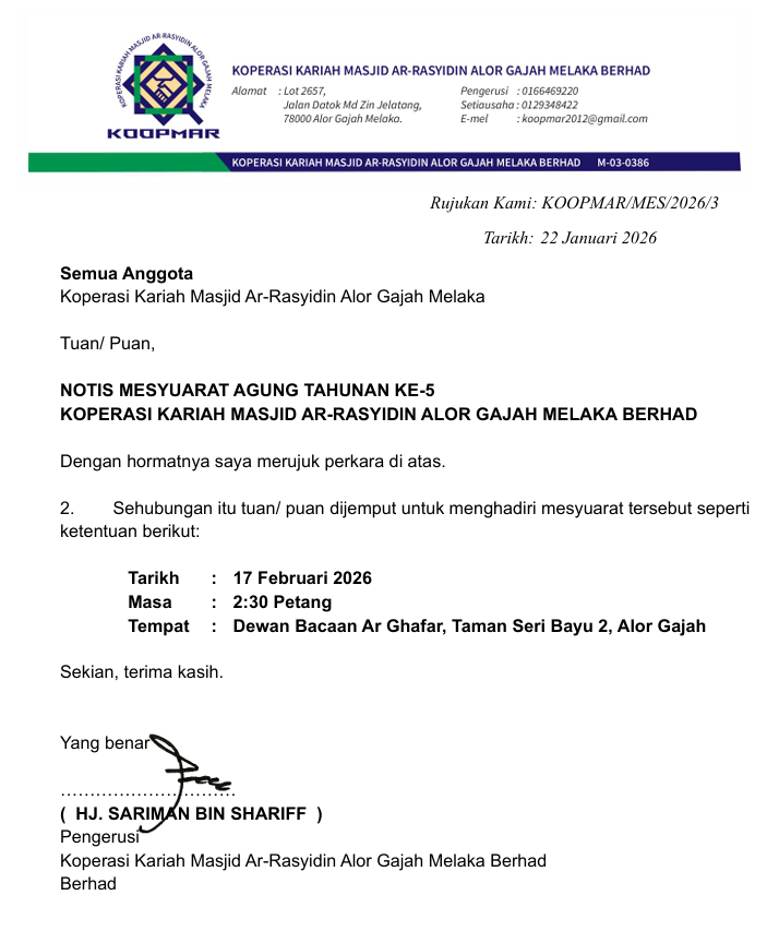 Semua ahli amat digalakkan hadir ke MAT ini kerana kehadiran anda memainkan peranan penting dalam memperkukuh koperasi serta memastikan pertumbuhan yang berterusan. MAT ini juga akan menjadi platform penting untuk menilai pencapaian koperasi, membincangkan rancangan masa hadapan, dan mengeratkan lagi perpaduan dalam kalangan ahli.